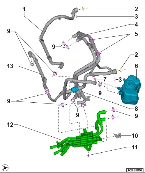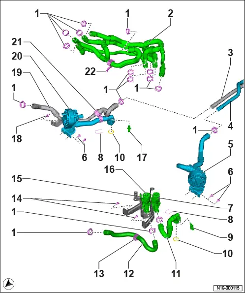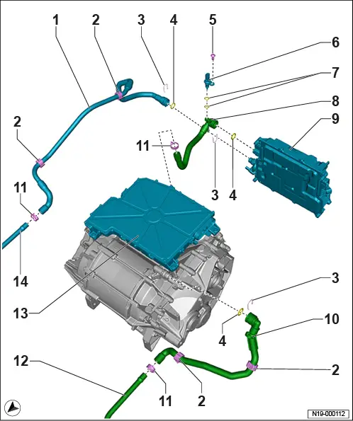 Montageübersicht - Kühlsystem, Heckantrieb 1 - Montageübersicht - Kühlsystem, hinten ❏ → Anker 2 - Montageübersicht - Kühlsystem, vorn links ❏ → Anker 3 - Montageübersicht - Kühlsystem, vorn rechts ❏ → Anker 1 - Montageübersicht - Kühlsystem, hinten 1 - Kühlmittelrohr hinten rechts 2 - Halteclip ❏ 4 Stück 3 - Sicherungsklammer ❏ 3 Stück 4 - O-Ring ❏ 3 Stück 5 - Schraube ❏ 8 Nm 6 - Temperaturfühler - G18 - ❏ → Rep.-Gr. 19 ; Temperaturfühler G18 aus- und einbauen 7 - O-Ring ❏ 2 Stück ❏ nach Demontage ersetzen 8 - Kühlmittelschlauch 9 - Ladegerät 1 für Hochvoltbatterie - AX4 - ❏ mit Steuergerät für Hochvolt-Batterieladegerät - J1050 - ❏ mit Spannungswandler - A19 - ❏ → Rep.-Gr. 93 ; Ladegerät 1 für Hochvoltbatterie AX4 aus- und einbauen 10 - Kühlmittelschlauch 11 - Schlauchschelle ❏ 3 Stück 12 - Kühlmittelrohr ❏ Rücklauf 13 - Leistungs- und Steuerelektronik für Elektroantrieb - JX1 - ❏ mit Drehstromantrieb - VX54 - ❏ → Rep.-Gr. 93 ; Leistungs- und Steuerelektronik für Elektroantrieb aus- und einbauen 14 - Kühlmittelrohr ❏ Vorlauf 2 - Montageübersicht - Kühlsystem, vorn links 1 - Schlauchschelle ❏ 16 Stück 2 - Kühlmittelschlauch ❏ Kühlmittelschlauch und Kühlmittelrohr sind mit Zahlen gekennzeichnet ❏ Zuordnung beachten 3 - Kühlmittelrohr ❏ Rücklauf 4 - Kühlmittelrohr ❏ Vorlauf 5 - Kühlmittelpumpe für Niedertemperaturkreislauf - V468 - ❏ → Rep.-Gr. 19 ; Montageübersicht - Elektrische Kühlmittelpumpe ❏ → Rep.-Gr. 19 ; Kühlmittelpumpe für Niedertemperaturkreislauf V468 aus- und einbauen 6 - Schraube ❏ 4 Stück ❏ 8 Nm 7 - Mischventil für Batterievorwärmung der Hochvoltbatterie - V683 - ❏ → Rep.-Gr. 19 ; Montageübersicht - Kühlmittelventile ❏ → Rep.-Gr. 19 ; Mischventil für Batterievorwärmung der Hochvoltbatterie V683 aus- und einbauen 8 - Sicherungsklammer ❏ 2 Stück 9 - Kühlmitteltemperaturgeber 1 für Hochvoltbatterie - G898 - ❏ → Rep.-Gr. 19 ; Montageübersicht - Kühlmitteltemperaturgeber ❏ → Rep.-Gr. 19 ; Kühlmitteltemperaturgeber 1 für Hochvoltbatterie G898 aus- und einbauen 10 - O-Ring ❏ 2 Stück 11 - Kühlmittelschlauch 12 - Kühlmittelschlauch ❏ ausstattungs-/baustandsabhängig 13 - Halteclip ❏ ausstattungs-/baustandsabhängig 14 - Schraube ❏ 2 Stück ❏ 8 Nm 15 - Halter für Mischventil 16 - Mischventil 2 für Batterievorwärmung der Hochvoltbatterie - V696 - ❏ ausstattungs-/baustandsabhängig ❏ → Rep.-Gr. 19 ; Montageübersicht - Kühlmittelventile ❏ → Rep.-Gr. 19 ; Mischventil 2 für Batterievorwärmung der Hochvoltbatterie V696 aus- und einbauen, Wärmepumpe 17 - Kühlmitteltemperaturgeber 2 für Hochvoltbatterie - G899 - ❏ → Rep.-Gr. 19 ; Montageübersicht - Kühlmitteltemperaturgeber ❏ → Rep.-Gr. 19 ; Kühlmitteltemperaturgeber 2 für Hochvoltbatterie G899 aus- und einbauen 18 - Spreizniet 19 - Kühlmittelschlauch 20 - Kühlmittelpumpe für Hochvoltbatterie - V590 - ❏ → Rep.-Gr. 19 ; Montageübersicht - Elektrische Kühlmittelpumpe ❏ → Rep.-Gr. 19 ; Kühlmittelpumpe für Hochvoltbatterie V590 aus- und einbauen 21 - Halteclip 22 - Halteclip 3 - Montageübersicht - Kühlsystem, vorn rechts 1 - Kühlmittelschlauch 2 - O-Ring ❏ 2 Stück 3 - Sicherungsklammer ❏ 2 Stück 4 - Kühlmittelschlauch 5 - Halteclip ❏ 2 Stück 6 - Kühlmittelausgleichsbehälter ❏ mit Geber für Kühlmittelmangelanzeige - G32 - ❏ → Rep.-Gr. 19 ; Kühlmittelausgleichsbehälter aus- und einbauen 7 - Schlauchschelle 8 - Thermostat ❏ Öffnungsbeginn 15 °C 9 - Schlauchschelle ❏ 11 Stück 10 - Halter für Kühlmittelsammelrohr 11 - Spreizniet 12 - Kühlmittelsammelrohr ❏ Kühlmittelschlauch und Kühlmittelrohr sind mit Zahlen gekennzeichnet ❏ Zuordnung beachten 13 - Kühlmittelschlauch