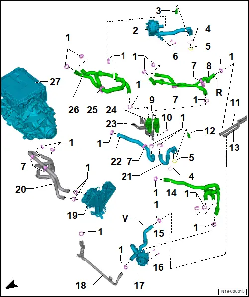 Montageübersicht - Kühlsystem, Allradantrieb 1 - Montageübersicht - Kühlsystem, hinten ❏ → Anker 2 - Montageübersicht - Kühlsystem, vorn links ❏ → Anker 3 - Montageübersicht - Kühlsystem, vorn rechts ❏ → Anker 1 - Montageübersicht - Kühlsystem, hinten 1 - Kühlmittelrohr hinten rechts 2 - Halteclip ❏ 4 Stück 3 - Sicherungsklammer ❏ 3 Stück 4 - O-Ring ❏ 3 Stück 5 - Schraube ❏ 8 Nm 6 - Temperaturfühler - G18 - ❏ → Rep.-Gr. 19 ; Temperaturfühler G18 aus- und einbauen 7 - O-Ring ❏ 2 Stück ❏ nach Demontage ersetzen 8 - Kühlmittelschlauch 9 - Ladegerät 1 für Hochvoltbatterie - AX4 - ❏ mit Steuergerät für Hochvolt-Batterieladegerät - J1050 - ❏ mit Spannungswandler - A19 - ❏ → Rep.-Gr. 93 ; Ladegerät 1 für Hochvoltbatterie AX4 aus- und einbauen 10 - Kühlmittelschlauch 11 - Schlauchschelle ❏ 3 Stück 12 - Kühlmittelrohr ❏ Rücklauf 13 - Leistungs- und Steuerelektronik für Elektroantrieb - JX1 - ❏ mit Drehstromantrieb - VX54 - ❏ → Rep.-Gr. 93 ; Leistungs- und Steuerelektronik für Elektroantrieb aus- und einbauen 14 - Kühlmittelrohr ❏ Vorlauf 2 - Montageübersicht - Kühlsystem, vorn links 1 - Schlauchschelle ❏ 20 Stück 2 - Kühlmittelpumpe für Hochvoltbatterie - V590 - ❏ → Rep.-Gr. 19 ; Montageübersicht - Elektrische Kühlmittelpumpe ❏ → Rep.-Gr. 19 ; Kühlmittelpumpe für Hochvoltbatterie V590 aus- und einbauen 3 - Kühlmitteltemperaturgeber 2 für Hochvoltbatterie - G899 - ❏ → Rep.-Gr. 19 ; Montageübersicht - Kühlmitteltemperaturgeber ❏ → Rep.-Gr. 19 ; Kühlmitteltemperaturgeber 2 für Hochvoltbatterie G899 aus- und einbauen 4 - Sicherungsklammer ❏ 2 Stück 5 - O-Ring ❏ 2 Stück 6 - Schraube ❏ 2 Stück ❏ 8 Nm 7 - Halteclip ❏ 5 Stück 8 - Kühlmittelschlauch ❏ Kennzeichnung -R- = Rücklauf 9 - Mischventil für Batterievorwärmung der Hochvoltbatterie - V683 - ❏ → Rep.-Gr. 19 ; Montageübersicht - Kühlmittelventile ❏ → Rep.-Gr. 19 ; Mischventil für Batterievorwärmung der Hochvoltbatterie V683 aus- und einbauen 10 - Schraube ❏ 3 Stück ❏ 8 Nm 11 - Kühlmittelrohr ❏ Rücklauf 12 - Kühlmitteltemperaturgeber 1 für Hochvoltbatterie - G898 - ❏ → Rep.-Gr. 19 ; Montageübersicht - Kühlmitteltemperaturgeber ❏ → Rep.-Gr. 19 ; Kühlmitteltemperaturgeber 1 für Hochvoltbatterie G898 aus- und einbauen 13 - Kühlmittelrohr ❏ Vorlauf 14 - Kühlmittelschlauch 15 - Kühlmittelschlauch ❏ Kennzeichnung -V- = Vorlauf 16 - Schraube ❏ 2 Stück ❏ 8 Nm 17 - Kühlmittelpumpe für Niedertemperaturkreislauf - V468 - ❏ → Rep.-Gr. 19 ; Montageübersicht - Elektrische Kühlmittelpumpe ❏ → Rep.-Gr. 19 ; Kühlmittelpumpe für Niedertemperaturkreislauf V468 aus- und einbauen 18 - Kühlmittelrohr 19 - Heizelement (PTC) 3 - Z132 - ❏ → Heizung, Klimaanlage; Rep.-Gr. 87 ; Kühlmittelkreislauf; Heizelement (PTC) 3 Z132 aus- und einbauen 20 - Kühlmittelschlauch 21 - Kühlmittelschlauch 22 - Kühlmittelschlauch ❏ ausstattungs-/baustandsabhängig 23 - Halter für Mischventile 24 - Mischventil 2 für Batterievorwärmung der Hochvoltbatterie - V696 - ❏ ausstattungs-/baustandsabhängig ❏ → Rep.-Gr. 19 ; Montageübersicht - Kühlmittelventile ❏ → Rep.-Gr. 19 ; Mischventil 2 für Batterievorwärmung der Hochvoltbatterie V696 aus- und einbauen 25 - Halteclip ❏ ausstattungs-/baustandsabhängig 26 - Kühlmittelschlauch ❏ ausstattungs-/baustandsabhängig 27 - Drehstromantrieb 2 - VX97 - ❏ mit Leistungs- und Steuerelektronik 2 für Elektroantrieb - JX4 - ❏ → Rep.-Gr. 10 ; Montageübersicht - Motor vorn ❏ → Rep.-Gr. 10 ; Motor vorn ausbauen ❏ → Rep.-Gr. 10 ; Motor vorn einbauen ❏ → Rep.-Gr. 93 ; Leistungs- und Steuerelektronik für Elektroantrieb aus- und einbauen 3 - Montageübersicht - Kühlsystem, vorn rechts 1 - Kühlmittelschlauch 2 - Halteclip ❏ 4 Stück 3 - O-Ring ❏ 2 Stück 4 - Sicherungsklammer ❏ 2 Stück 5 - Schlauchschelle ❏ 10 Stück 6 - Thermostat ❏ Öffnungsbeginn 15 °C 7 - Kühlmittelschlauch 8 - Schlauchschelle 9 - Kühlmittelausgleichsbehälter ❏ mit Geber für Kühlmittelmangelanzeige - G32 - ❏ → Rep.-Gr. 19 ; Kühlmittelausgleichsbehälter aus- und einbauen 10 - Kühlmittelsammelrohr ❏ Kühlmittelschlauch und Kühlmittelrohr sind mit Zahlen gekennzeichnet ❏ Zuordnung beachten 11 - Spreizniet 12 - Drehstromantrieb 2 - VX97 - ❏ mit Leistungs- und Steuerelektronik 2 für Elektroantrieb - JX4 - ❏ → Rep.-Gr. 10 ; Montageübersicht - Motor vorn ❏ → Rep.-Gr. 10 ; Motor vorn ausbauen ❏ → Rep.-Gr. 10 ; Motor vorn einbauen ❏ → Rep.-Gr. 93 ; Leistungs- und Steuerelektronik für Elektroantrieb aus- und einbauen