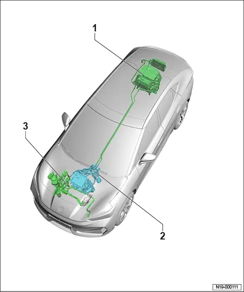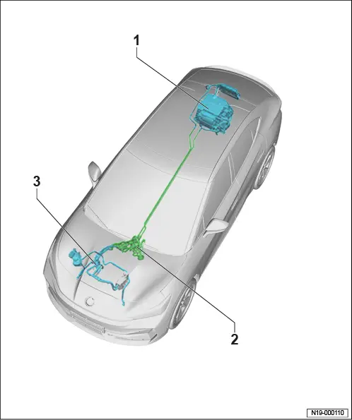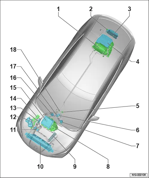 Einbauorteübersicht - Kühlsystem, Allradantrieb 1 - Drehstromantrieb - VX54 - ❏ → Rep.-Gr. 10 ; Montageübersicht - Motor hinten ❏ → Rep.-Gr. 10 ; Motor hinten ausbauen ❏ → Rep.-Gr. 10 ; Motor hinten einbauen 2 - Temperaturfühler - G18 - ❏ oben am Ladegerät 1 für Hochvoltbatterie - AX4 - im Schlauchanschluss ❏ → Rep.-Gr. 19 ; Temperaturfühler G18 aus- und einbauen 3 - Ladegerät 1 für Hochvoltbatterie - AX4 - ❏ mit Steuergerät für Hochvolt-Batterieladegerät - J1050 - ❏ mit Spannungswandler - A19 - ❏ → Rep.-Gr. 93 ; Ladegerät 1 für Hochvoltbatterie AX4 aus- und einbauen 4 - Leistungs- und Steuerelektronik für Elektroantrieb - JX1 - ❏ → Rep.-Gr. 93 ; Leistungs- und Steuerelektronik für Elektroantrieb aus- und einbauen 5 - Kühlmitteltemperaturgeber 1 für Hochvoltbatterie - G898 - ❏ Batterie Eingang (Vorlauf) ❏ → Rep.-Gr. 19 ; Kühlmitteltemperaturgeber 1 für Hochvoltbatterie G898 aus- und einbauen 6 - Mischventil 2 für Batterievorwärmung der Hochvoltbatterie - V696 - ❏ ausstattungs-/baustandsabhängig ❏ → Rep.-Gr. 19 ; Mischventil 2 für Batterievorwärmung der Hochvoltbatterie V696 aus- und einbauen 7 - Kühlmittelpumpe für Niedertemperaturkreislauf - V468 - ❏ → Rep.-Gr. 19 ; Kühlmittelpumpe für Niedertemperaturkreislauf V468 aus- und einbauen 8 - Drehstromantrieb 2 - VX97 - ❏ → Rep.-Gr. 10 ; Montageübersicht - Motor vorn ❏ → Rep.-Gr. 10 ; Motor vorn ausbauen ❏ → Rep.-Gr. 10 ; Motor vorn einbauen 9 - Heizelement (PTC) 3 - Z132 - ❏ → Heizung, Klimaanlage; Rep.-Gr. 87 ; Kühlmittelkreislauf; Heizelement (PTC) 3 Z132 aus- und einbauen 10 - Kühlermodul ❏ → Rep.-Gr. 19 ; Kühlermodul aus- und einbauen 11 - Wärmetauscher für Hochvoltbatterie ❏ → Heizung, Klimaanlage; Rep.-Gr. 87 ; Kältemittelkreislauf; Wärmetauscher für Hochvoltbatterie aus- und einbauen 12 - Kühlmittelausgleichsbehälter ❏ mit Geber für Kühlmittelmangelanzeige - G32 - ❏ → Rep.-Gr. 19 ; Kühlmittelausgleichsbehälter aus- und einbauen 13 - Thermostat ❏ → Rep.-Gr. 19 ; Montageübersicht - Kühlsystem, Allradantrieb 14 - Ventileinheit Wärmepumpe ❏ ausstattungs-/baustandsabhängig ❏ → Heizung, Klimaanlage; Rep.-Gr. 87 ; Ventileinheit Wärmepumpe; Ventileinheit Wärmepumpe aus- und einbauen 15 - Leistungs- und Steuerelektronik 2 für Elektroantrieb - JX4 - ❏ → Rep.-Gr. 93 ; Leistungs- und Steuerelektronik für Elektroantrieb aus- und einbauen 16 - Kühlmittelpumpe für Hochvoltbatterie - V590 - ❏ → Rep.-Gr. 19 ; Kühlmittelpumpe für Hochvoltbatterie V590 aus- und einbauen 17 - Mischventil für Batterievorwärmung der Hochvoltbatterie - V683 - ❏ → Rep.-Gr. 19 ; Mischventil für Batterievorwärmung der Hochvoltbatterie V683 aus- und einbauen 18 - Kühlmitteltemperaturgeber 2 für Hochvoltbatterie - G899 - ❏ Batterie Ausgang (Rücklauf) ❏ → Rep.-Gr. 19 ; Kühlmitteltemperaturgeber 2 für Hochvoltbatterie G899 aus- und einbauen