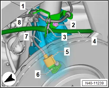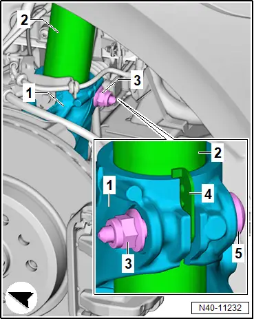 Lenkung; Rep.-Gr. 40 ; Gelenkwelle; Gelenkwelle aus- und einbauen . Fortsetzung für alle Fahrzeuge – Halteklammer -3- abziehen und Bremsschlauch -4- aushängen. – Schraube -2- am Radlagergehäuse -7- herausdrehen. – Halter -1- mit elektrischen Leitungen -8- zur Seite legen. – Elektrische Steckverbindung -5- am Drehzahlfühler -6- trennen. – Bremsscheibe ausbauen . → Bremsanlage; Rep.-Gr. 46 ; Vorderradbremse; Bremsscheibe aus- und einbauen – Steinschlagschutz für Achslenker ausbauen → Rep.-Gr. 40 ; Steinschlagschutz für Achslenker aus- und einbauen . – Schrauben -Pfeile- herausdrehen und Abdeckblech -1- abnehmen. Fahrzeuge mit Geber für Fahrzeugniveau – Geber für Fahrzeugniveau am Achslenker ausbauen → Rep.-Gr. 43 ; Geber für Fahrzeugniveau vorn G78/G289 aus- und einbauen . Fortsetzung für alle Fahrzeuge – Muttern -3- abschrauben. – Achslenker -2- vom Achsgelenk abziehen -Pfeilrichtung A- . – Radlagergehäuse -1- nach außen ziehen -Pfeilrichtung B- . – Radlagergehäuse -1- nach außen wegdrehen, um den Achslenker -2- zu entlasten. – Spurstangenkopf vom Radlagergehäuse abdrücken → Rep.-Gr. 48 ; Spurstangenkopf aus- und einbauen . – Mutter -3- abschrauben. – Schraube -5- herausziehen. Beschädigungsgefahr Federbein -3- durch Abbrechen der Führung -2- . – Federbein -3- zum Lösen nicht verdrehen. – Radlagergehäuse -1- nicht gegen die Führung -2- verdrehen. Montageübersicht - Radlagerung