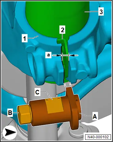 – Radlagergehäuse -1- mit Spreizvorrichtung - VAS 751 003 - - A- aufspreizen. Mit geeigneten Werkzeugen am Sechskant -B- der Spindel drehen und an gerader Fläche -C- gegenhalten .