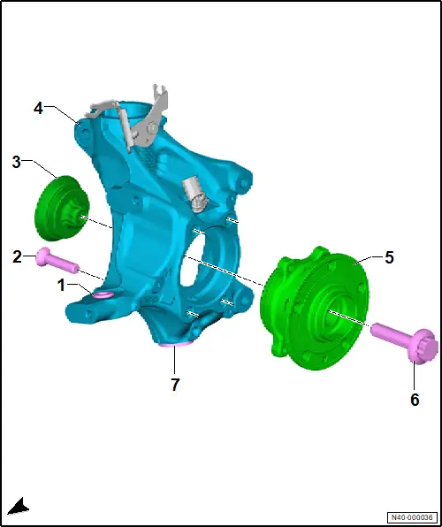 Montageübersicht - Radlagerung, Heckantrieb Die Übersicht ist beispielhaft für die linke Fahrzeugseite dargestellt 1 - Buchse 2 - Schraube ❏ 3 Stück ❏ nach Demontage ersetzen ❏ M 12 x 1,5 x 45 ❏ 90 Nm +90° 3 - Scheibe 4 - Radlagergehäuse ❏ ausstattungs-/baustandsabhängig ❏ Zuordnung → Elektronischer Teilekatalog (ETKA) ❏ → Rep.-Gr. 40 ; Radlagergehäuse aus- und einbauen 5 - Radlagereinheit ❏ → Rep.-Gr. 40 ; Radlagereinheit aus- und einbauen 6 - Schraube ❏ nach Demontage ersetzen ❏ M 16 x 1,5 x 70 ❏ 200 Nm +90° 7 - Buchse