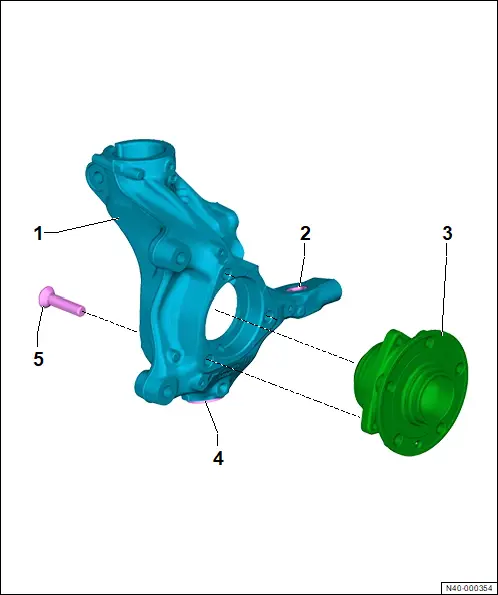 Montageübersicht - Radlagerung Die Übersicht ist beispielhaft für die linke Fahrzeugseite dargestellt 1 - Radlagergehäuse ❏ ausstattungs-/baustandsabhängig ❏ Zuordnung → Elektronischer Teilekatalog (ETKA) ❏ → Rep.-Gr. 40 ; Radlagergehäuse aus- und einbauen 2 - Buchse 3 - Radlagereinheit ❏ → Rep.-Gr. 40 ; Radlagereinheit aus- und einbauen 4 - Buchse 5 - Schraube ❏ 3 Stück ❏ nach Demontage ersetzen ❏ M 12 x 1,5 x 45 ❏ 90 Nm +90°