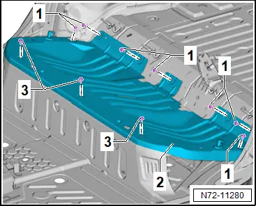 Sitzwanne aus- und einbauen Ausbauen – Sitzbank ausbauen → Rep.-Gr. 72 ; Sitzbank / Einzelsitze aus- und einbauen . – Einstiegsleiste hinten ausbauen → Rep.-Gr. 70 ; Einstiegsleiste hinten aus- und einbauen . – Bodenbelag im Bereich der Sitzwanne nach vorn schlagen. – Schrauben -1- und -3- herausdrehen. – Sitzwanne -2- herausnehmen. Einbauen Der Einbau erfolgt in umgekehrter Reihenfolge, dabei Folgendes beachten: Anzugsdrehmomente ♦ → Rep.-Gr. 72 ; Montageübersicht - Sitzbank / Einzelsitze