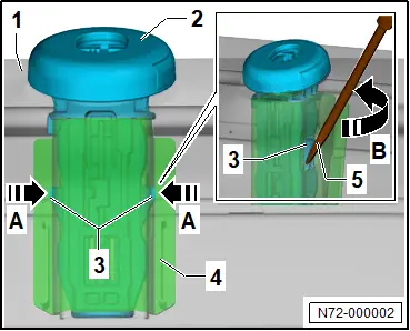 flache Seite der Schraubendreherklinge am Rasthaken anliegt. – Jeweils einen Schraubendreher seitlich vom Kopfstützenrohr -4- bis zum Rasthaken -3- schieben. – Beide Schraubendreher um 90° in -Pfeilrichtung B- drehen und Rasthaken -3- in -Pfeilrichtung A- entriegeln. – Kopfstützenführung -2- mit 3. Schraubendreher aus Kopfstützenrohr -4- abhebeln. Einbauen Der Einbau erfolgt in umgekehrter Reihenfolge.