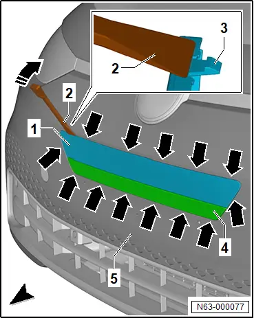 – Blende -1- aus Stoßfängerabdeckung -5- heraushebeln.