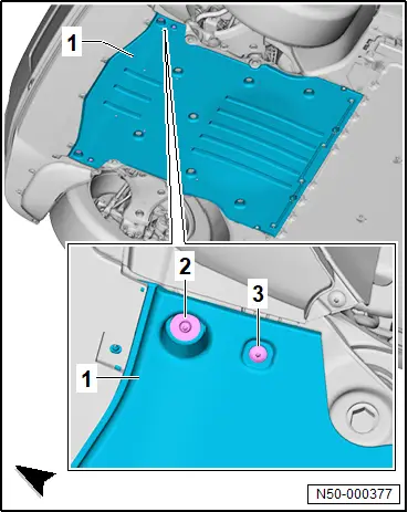 Servicestellung des Stoßfängerträgers durchführen und zurücksetzen Benötigte Spezialwerkzeuge, Prüf- und Messgeräte sowie Hilfsmittel ♦ Adapter - T10467 - ♦ Adapter - T10480 - ♦ Führungsstange - T10093 - ♦ Führungsstange - T10228 - Servicestellung des Stoßfängerträgers durchführen – Scheinwerfer ausbauen → Elektrische Anlage; Rep.-Gr. 94 ; Scheinwerfer; Scheinwerfer aus- und einbauen . – Schlossträger ausbauen → Rep.-Gr. 50 ; Schlossträger aus- und einbauen . – Schrauben -2- und -3- an Unterbodenverkleidung vorn -1- links und rechts herausdrehen. – Schraube am Längsträger auf beiden Fahrzeugseiten herausdrehen und Führungsstange - T10093 - -4- am Längsträger eindrehen. – Schraube -2- am Längsträger auf beiden Fahrzeugseiten herausdrehen. – Mittige Schrauben -6- auf beiden Fahrzeugseiten herausdrehen und Führungsstange - T10228 - -5- eindrehen. – Äußere Schrauben -6- auf beiden Fahrzeugseiten herausdrehen. – Elektrische Steckverbindungen trennen. –
